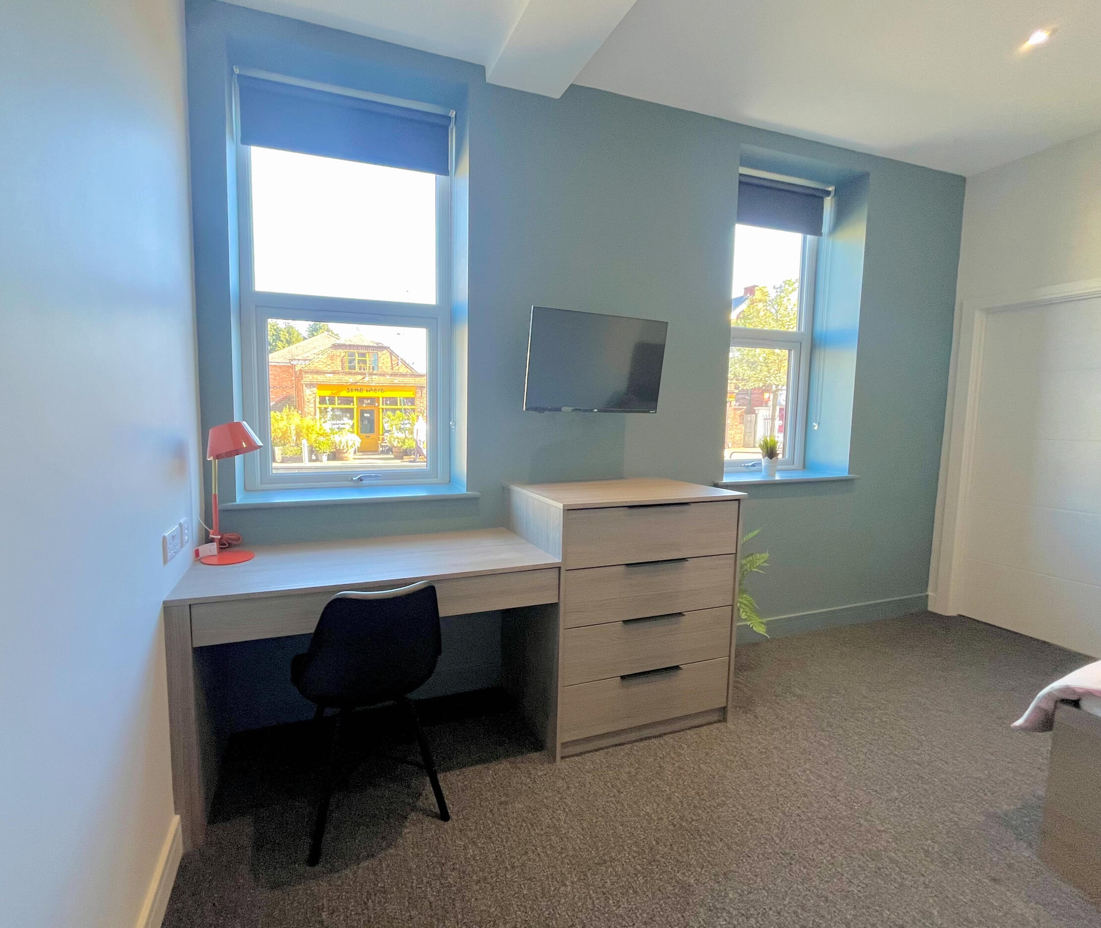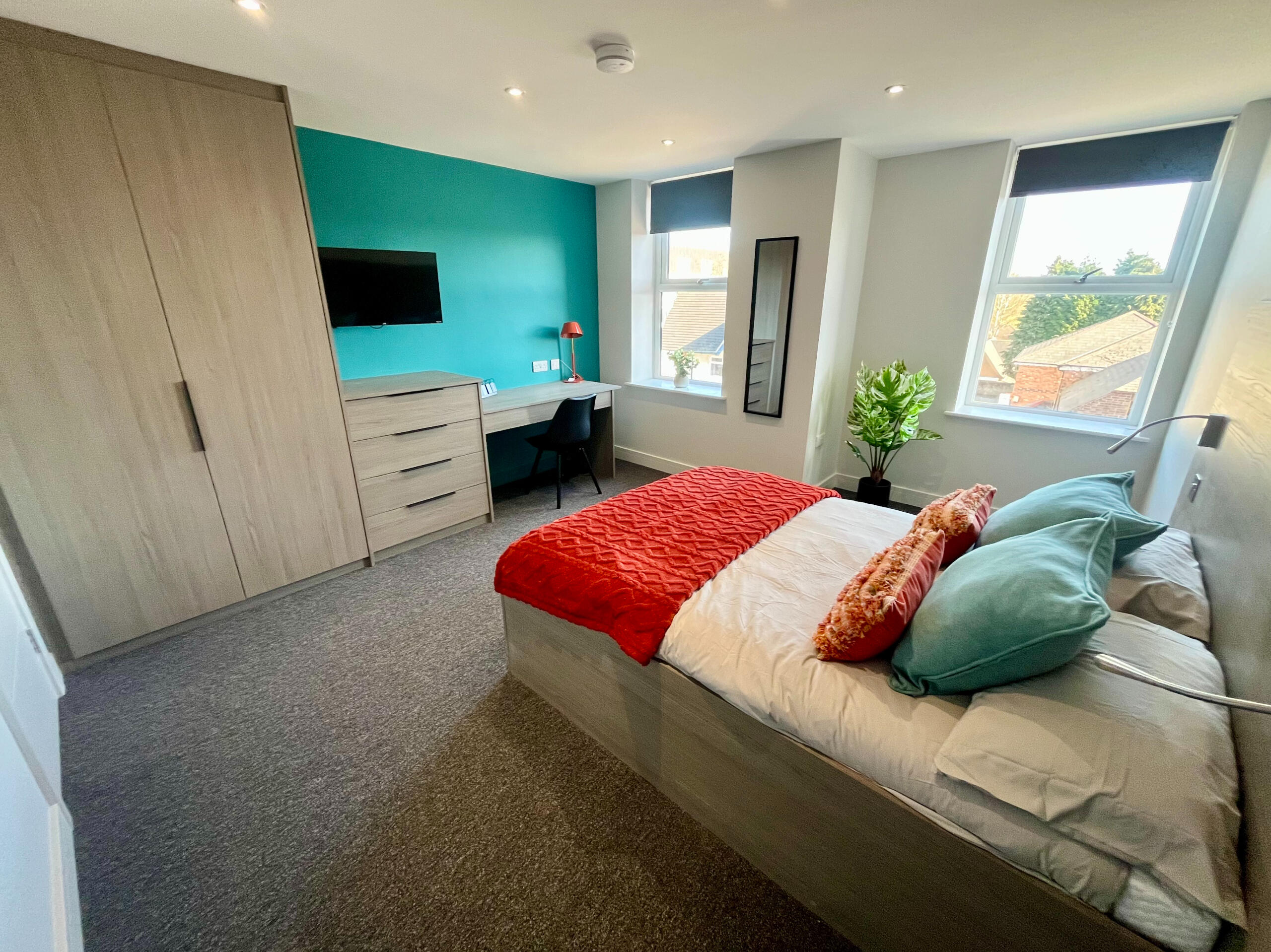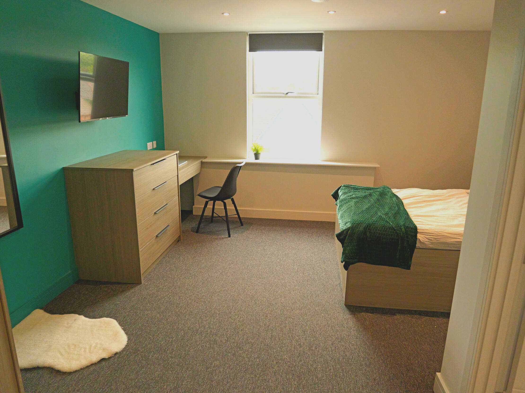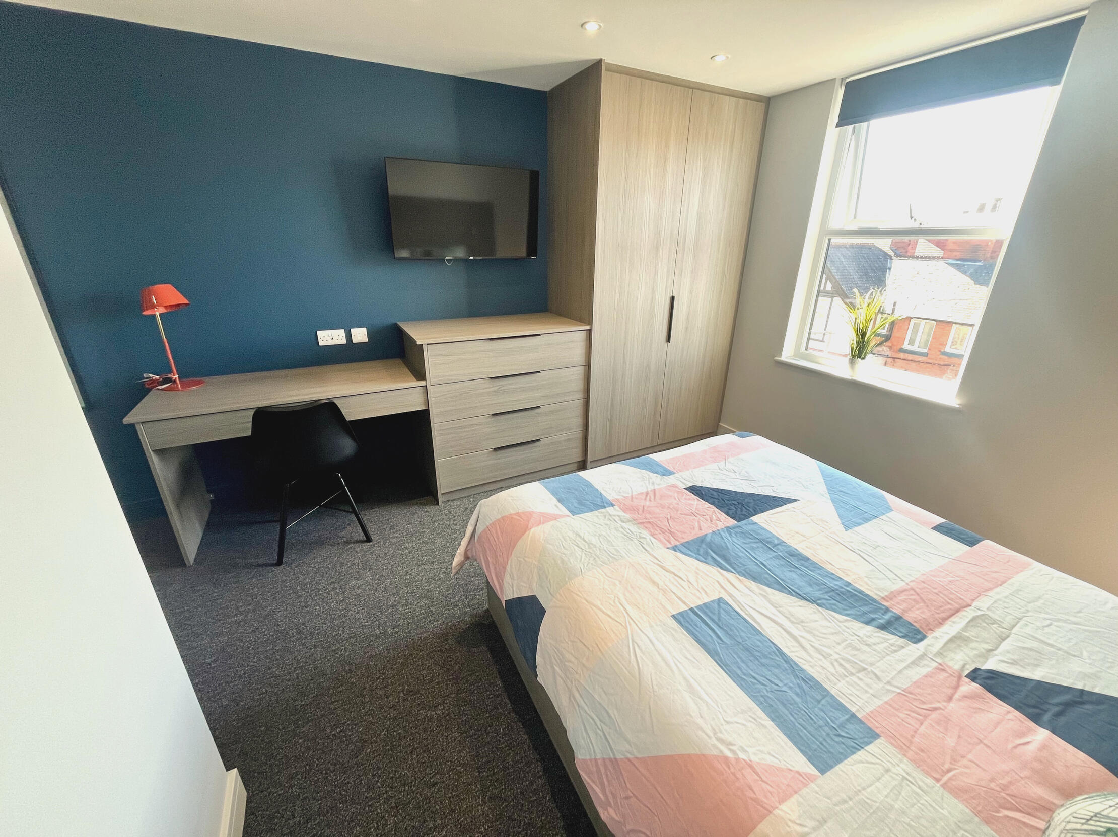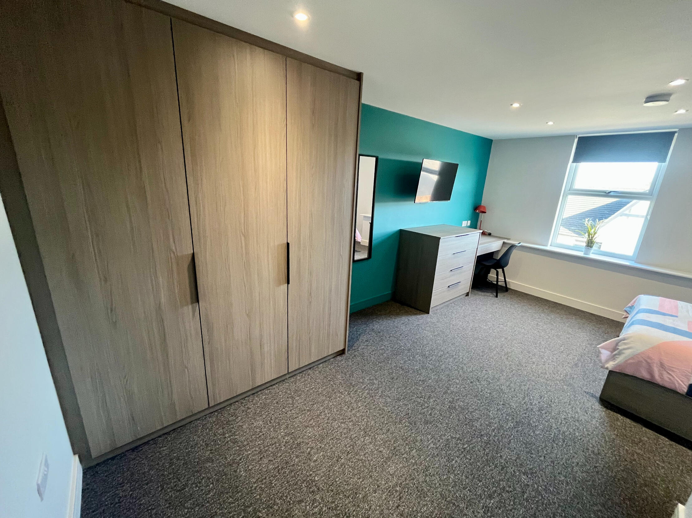 This modern property is fully equipped with underfloor heating in every room, ensuring a warm and cozy living environment during the colder months. Enjoy ultra-fast Wi-Fi with top-tier internet speeds, perfect for streaming, studying, and gaming.Each bedroom comes with its own TV, a convenient bedside lamp, and a clean, minimalist no-central-light design that enhances comfort and ambience. Thoughtfully furnished with a large double-door wardrobe and an ergonomic desk and chair setup for productive study or remote work.A full-length mirror adds both style and practicality to the room, ideal for daily routines and getting ready.